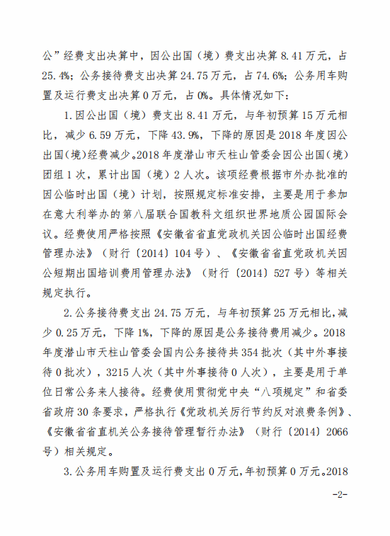 潜山市天柱山管委会2018年度一般公共预算财政拨款“三公”经费支出决算情况说明