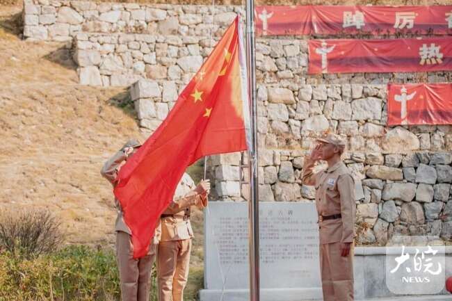 大皖新闻讯 10月1日上午,抗美援朝老兵及其子女、港澳台同胞代表以及天柱山游客、志愿者在天柱山爱园举行。伴随着庄严雄壮的国歌,鲜艳的五星红旗缓缓升起,在湛蓝的天空上高高飘扬,全体人员面向国旗庄严敬礼。他们凝视着鲜红的国旗,表达最崇高的敬意,在“祖国母亲 我想对您说”大型留言板上向祖国母亲深情告白。