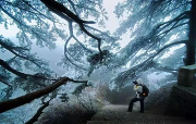 特色: 雾凇非冰非雪,而是由于雾中无数零摄氏度以下而尚未凝华的水蒸气随风在树枝上不断积聚冻粘的结果,表现为白色不透明的粒状结构沉积物。雾凇形成需要气温很低,而且水汽又很充分,同时能具备这两个形成雾凇的极重要而又相互矛盾的自然条件更是难得。雾松具有“美、媚、柔、透”等特点,极具观赏性。她全方位、大面积覆盖,装点着天柱山的树木、山峰、岩石、大地。风一吹来,挂着雾凇的树...